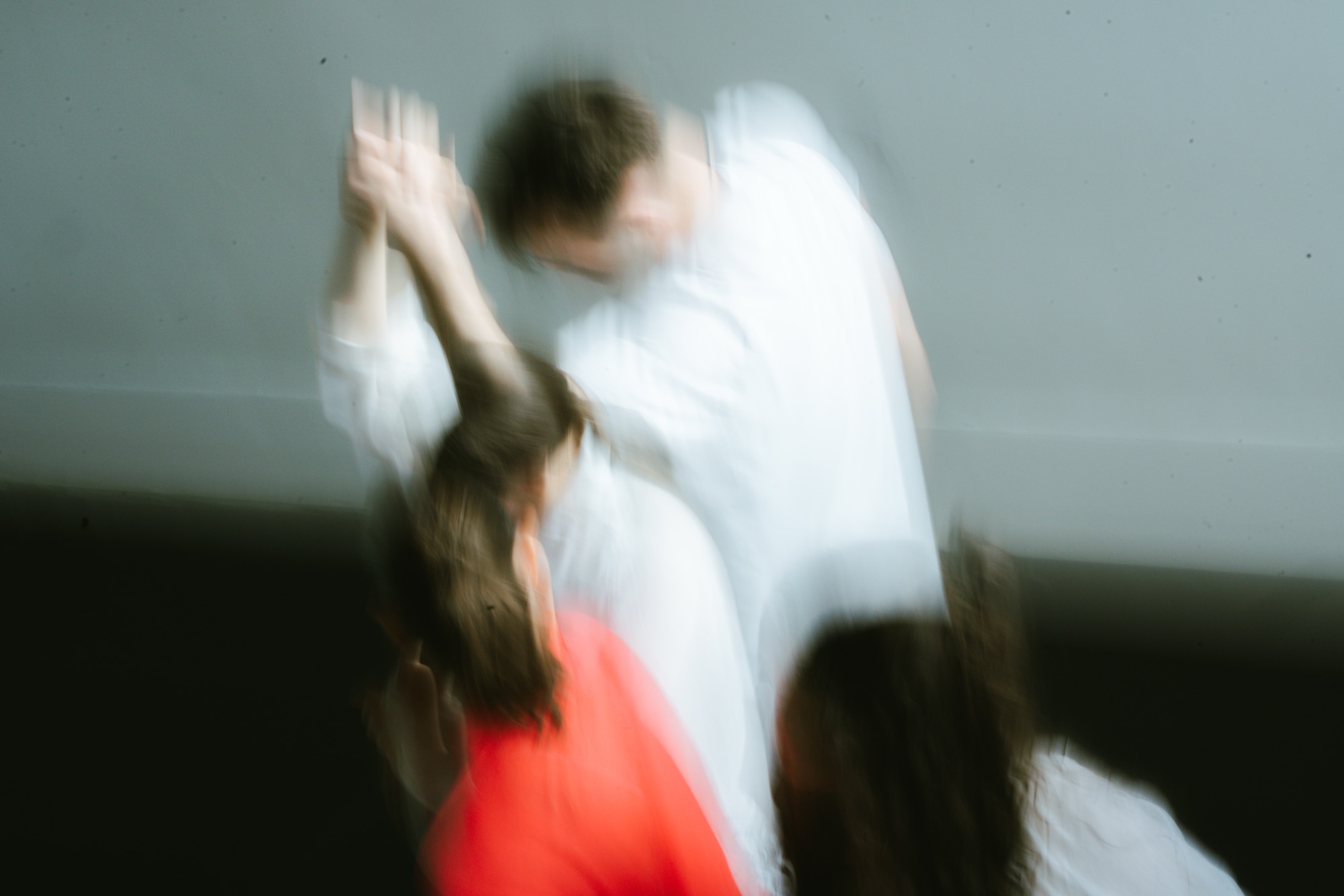 The red shirt of the solo performer may be a signifier for the individual power and self-esteem that is accessed in the relationship with self. As the only performer who wears red, it could also signify a sense of urgency to discover oneself further or moreso, to seek connection.