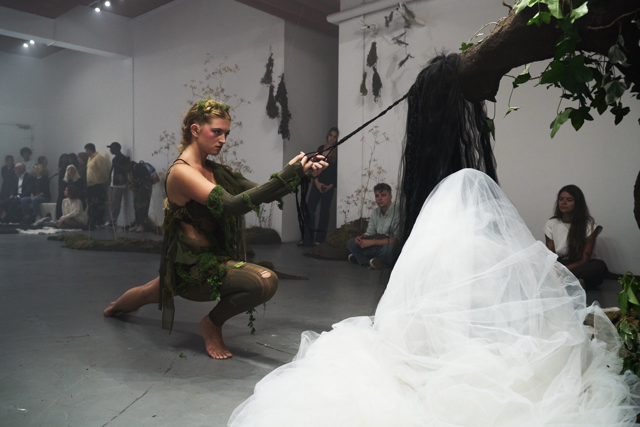 Marchela: Definitely what was important to me was for it not to be a black box theatre, I really wanted to escape that. But it is also really important who we align ourselves with and Proposition, they just stole my heart. A lot about Samodiva is rewilding the human, and these were also their values, supporting ecology and supporting artists. Yes, it’s a beautiful gallery, but my main decision making point was that they have very similar morals to us, and I knew that what is important to me as a creator and to the rest of my creative team will be important to them and that we can mutually benefit from creating that experience together and enriching our separate audiences. On that same topic, they were quite interested in how we incorporate ecology to what we do, so a lot of our set was entirely taken from a forest. It was dirt and plants, and we recreated a lake inside there as well. Our costume designer used a lot of ecological materials to create the costumes, so we are as eco-friendly as possible.